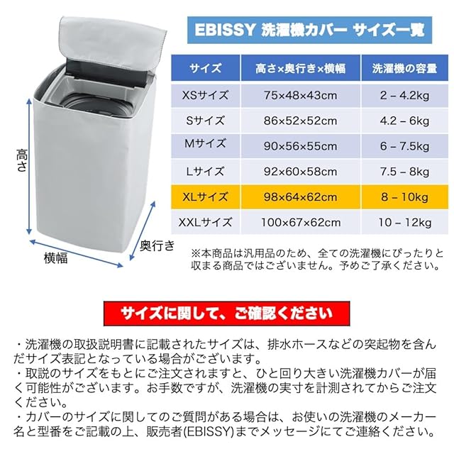 仕様 : ファスナー(ジッパー)開閉式 4面すっぽり囲い / XLサイズ : (約) 高さ98cm×奥行き64cm×横幅62cm / 洗濯機の容量 : 8-10kg