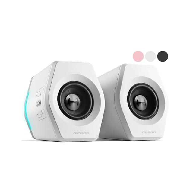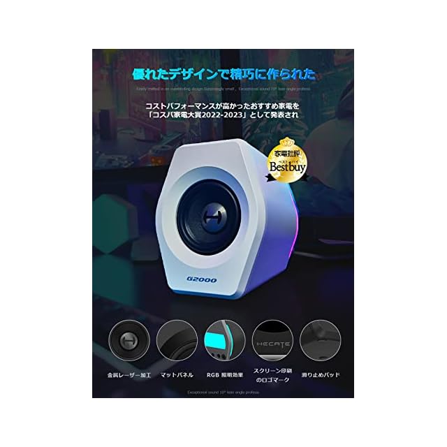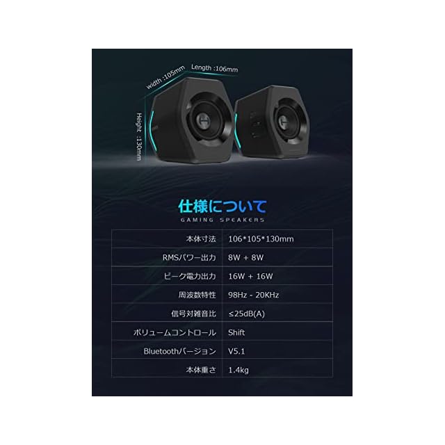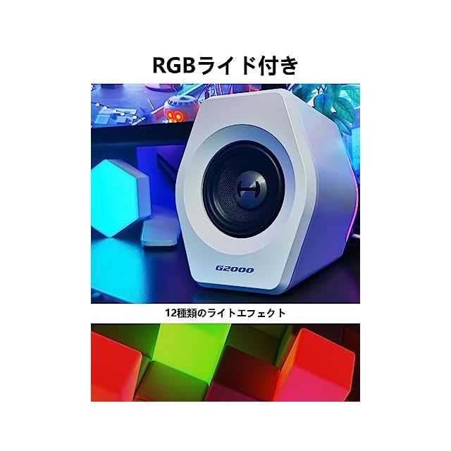 【SUB-OUT端子付き】Subout端子を使って他の2.0、2.1、5.1スピーカーやサブウーファーに接続し、より強力な4.0、2.1、4.1、7.1サラウンドサウンドシステムを構築し、さまざまな音の豊かな細部を向上させ、ゲームや映画の臨場感と没入感を高めます。 【Hi-Fi高音質&EQモードゲーミングスピーカー】プロフェッショナルな設計により、クリアな高音、詳細な中音、豊かな低音で、音楽用の最高のオーデイオ性能を提供します.プロ仕様のオーディオチップセットを内蔵し、ゲーム、映画、音楽用のEQサウンドモードが可能です. 【 驚きの出力パワー パソコンスピーカー 】独立した電源が16W RMSと最大32Wのピークパワーを提供し;360度サラウンドサウンドでより快適なステレオ体験に;HIFIグレード2.75インチフルレンジドライバーを搭載、Hi-Fi鮮やかな音質を実現します. 【フルカラーRGBライト】当社のゲーミングスピーカーには、12色を自由に切り替えられる美しいRGBライトが搭載されています.暗いところではさらにカッコよく見えます.より魅力的なゲーム/音楽/映画の雰囲気をお楽しみます. 【コンパクトPCスピーカー】PC モニターの左右に設置できる小型ボディで、デスクスペースを節約できます.Bluetooth 5.1技術を搭載し、耐久性と安定性に優れ、スマートフォンやその他のBluetooth対応デバイスとの接続がより簡単かつ迅速になります.寸法:10.6 x 10.5 x 13CM