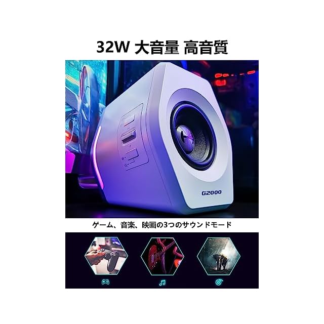 商品名:Edifier G2000 2.0ch PC スピーカー パソコン PS5 Switch ゲーム用 ゲーミングスピーカー、32W 小型 Hi-Fi音質、Bluetooth/USB/3.5mm AUX 有線無線接続、ゲーム/音楽/映画モード対応/RGB ホワイト