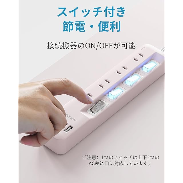 【スイッチ付き・節電・省エネ】コンセントには接続機器のON/OFFができるスイッチが付いており、使わないところは切って電力を節約することができます。スイッチLEDランプが付いており、一目で通電が見えて安心です。(※ご注意:各スイッチは上下2つのAC差込口を制御します。)