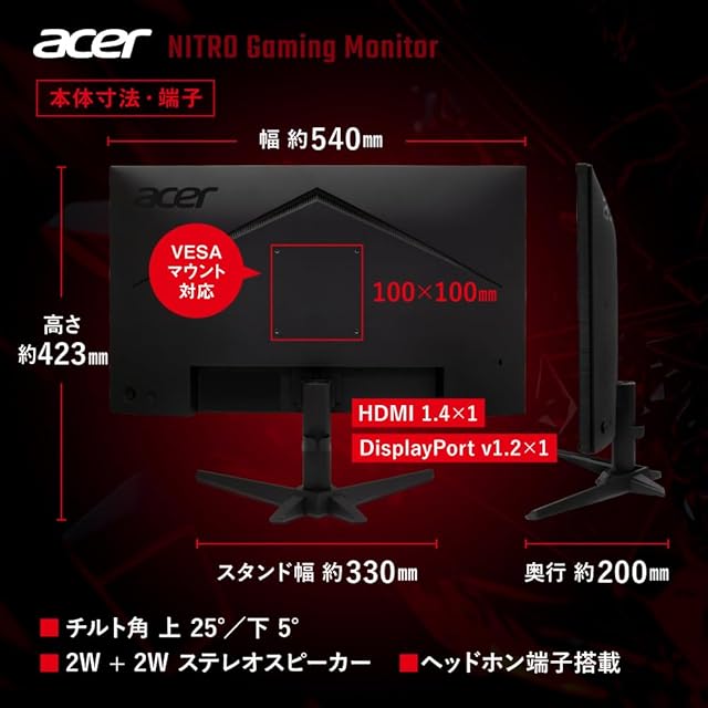 Acer Nitro ゲーミングモニター 23.8インチ ワイド フルHD 非光沢 IPS 120Hz 1ms(VRB) sRGB 99% AdaptiveSync ブラックブースト HDMI 1.4 DisplayPort 1.2 スピーカー内蔵 ヘッドフォン端子 VESAマウント対応 ゼロフレームデザイン QG241YGbmipx | TREND DESIGN 家電専門店