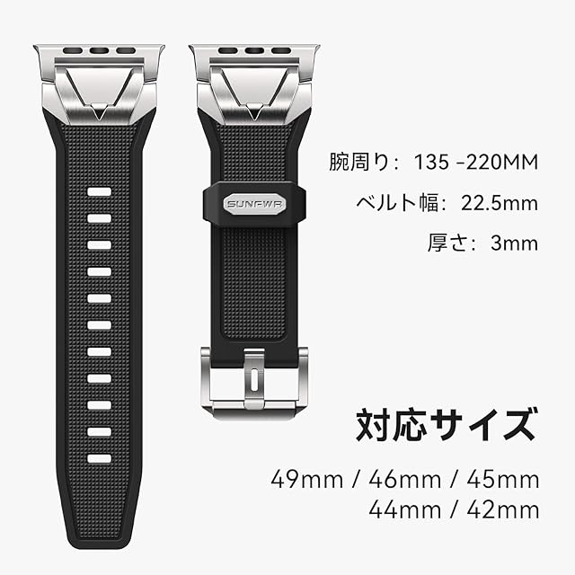 SUNFWR アップルウォッチ バンドは、コンパチブルApple Watch Ultra 2/1・Series 10~1・SE2/SE、手首135~220mmに柔軟フィット。TPUを超える肌馴染みを実現した高純度液体シリコンを採用し、低刺激設計で敏感肌でも安心。耐汗・耐摩擦性に優れ変色・硬化ゼロの耐久性に加え、環境配慮型素材で環境ホルモン不含。スポーティで洗練されたデザインはステンレスアダプターの確固たる固定性と通気孔構造を融合、ビジネスからアウトドアまで24時間快適に装着可能。工具不要3秒着脱&軽量柔軟性で日常から激しい運動シーンまで対応。12ヶ月+24時間サポート付きで、機能性とスタイルを兼ね備えた次世代バンドです。