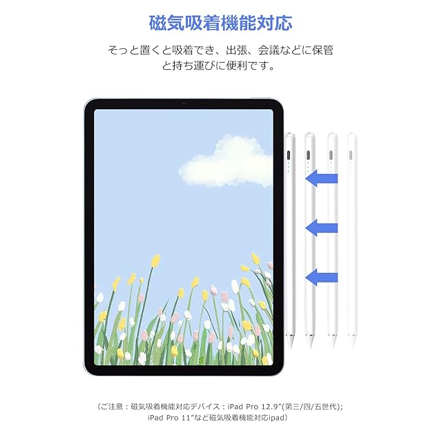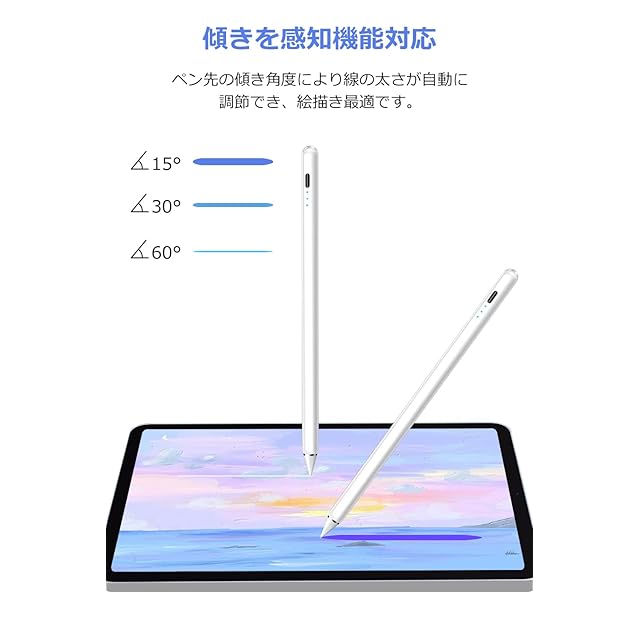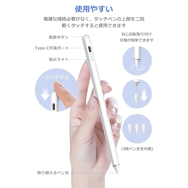 商品名:タッチペン タブレット 【2025年モデル ipad ペン】 スタイラスペン ipad ペンシル 傾き感知 磁気吸着機能 極細 超高感度 誤作動防止 軽量 耐摩 Type-C急速充電 2018年以降iPad/iPad Pro/Air/Mini対応 三つ交換用ペン先 5分自動スリープ 学生 デザイン用