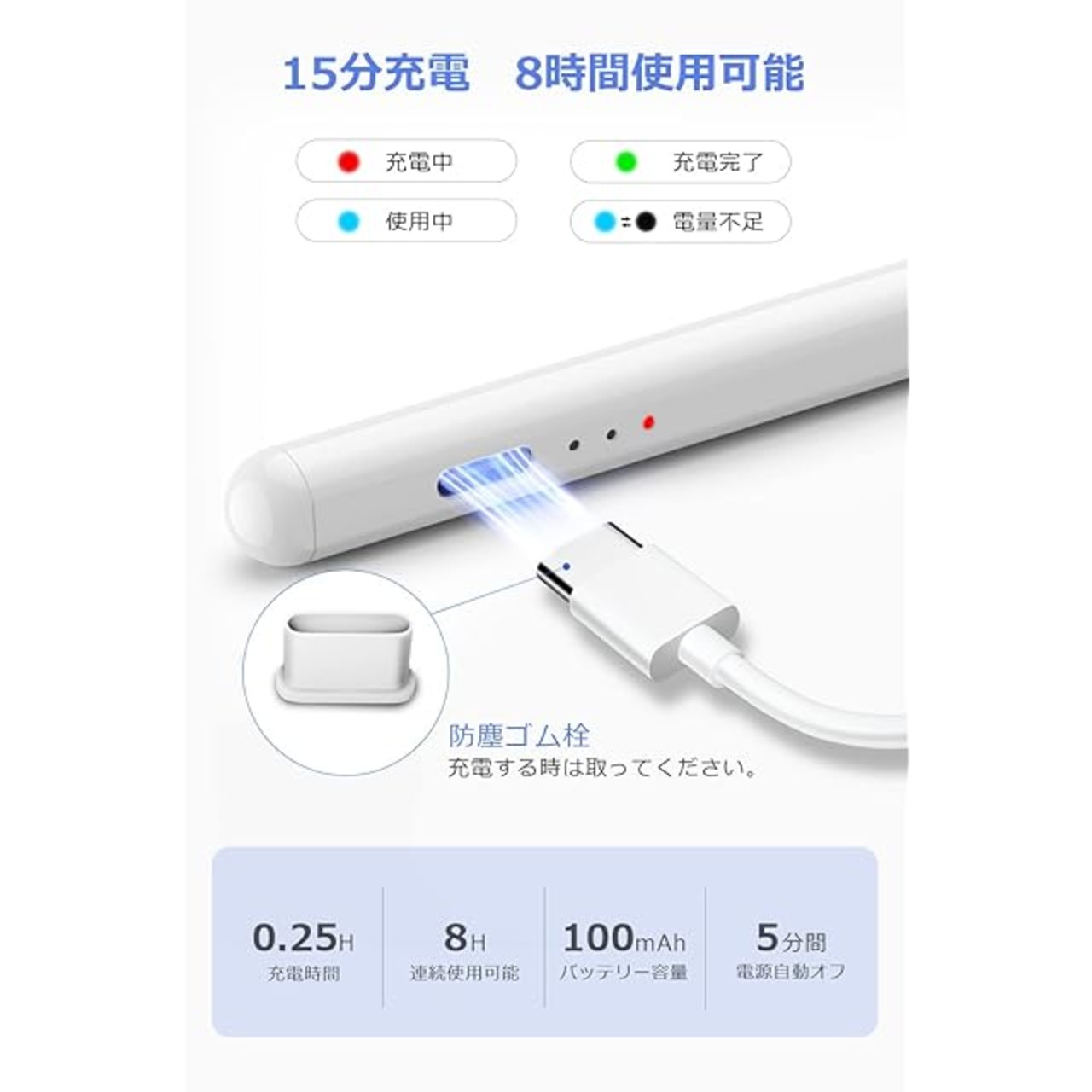 【USB-C急速充電型&Bluetooth接続不要】本製品は急速充電に対応しています。大体15分-20分ぐらいで充電完了し、8時間持続可能です。Bluetooth接続とアプリの必要がなく、iPadスタイラスペンの上部を軽く二回タップすると、電源のon/offができるように仕様です。
