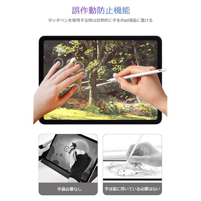 【磁気吸着機能&誤作動防止&傾き感知】磁気吸着機能により、タッチペンがiPadの側面をしっかり吸着することができ、非常に便利です。誤接触防止機能により、文字を書いたり、絵を描いたりするときに、手を画面から離したり、手袋をして絵を描いたりする必要がなくなり、作業効率や使い心地が大幅に向上します。傾きを感知できるので、ペン先の傾き角度により線の太さが自動的に調節でき、絵描き最適です。(ご注意:傾き感知機能対応ソフト:SketchBook、Procreate、Paper、Noteshelf 、Art Set)