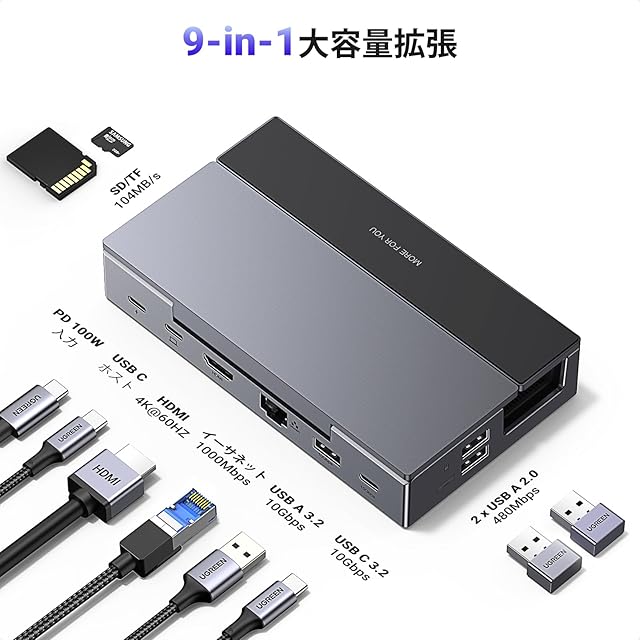 UGREEN Steam deck/Switch/Rog Ally/Legion Go用TVドック 9-IN-1 USB-Cハブ ドッキングステーション HDMI4K@60HZ 10Gbps高速転送 USb-A3.2*USB-C 3.2 1000Mbpsイーサネット 2*USB2.0ポート SD/TFカード読み取り 100W(出力85W) PD対応 遅延なし 角度調整可能スタンド | TREND DESIGN 家電専門店