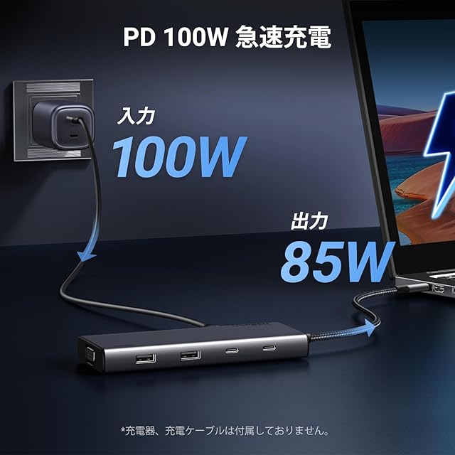 100W 電力供給: ノートパソコン用ドッキング ステーション デュアル モニターは、USB-C PD ポート経由で最大 85W の USB-C パススルー充電をサポートし、他のインターフェイス操作用に 15W を確保します。