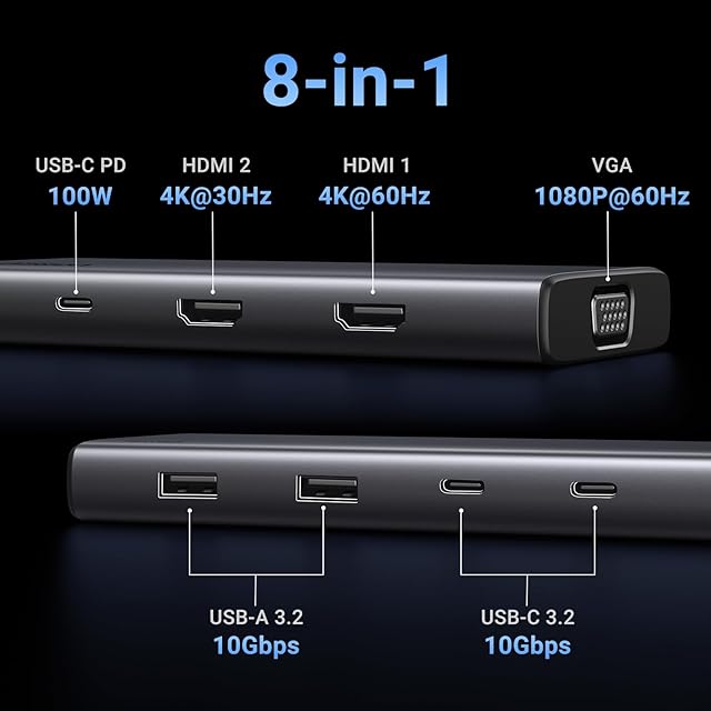 8-in-1 USB C ドッキング ステーション: 2 つの HDMI ポート、1 つの VGA ポート、2 つの 10 Gbps USB-C 3.2 Gen 2 ポート、2 つの 10 Gbps USB-A 3.2 Gen 2 ポート、100W 電源供給により、ノートパソコンの USB-C ポートの可能性をさらに引き出します。
