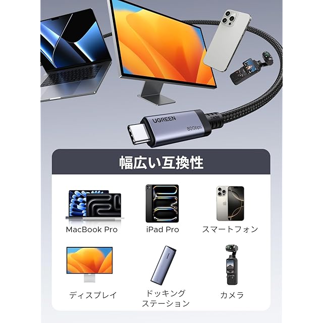 商品名:UGREEN USB4 Gen4 ケーブル 80Gbps双方向高速データ伝送 PD3.1 240W急速充電対応 Thunderbolt4/3 USB 3下位互換 16K@60Hz映像出力 高耐久性ナイロン編み USB-C to USB-Cケーブル iPhone 16/Galaxy S24/MacBook Pro/iPad/Android/ハブなどタイプC対応機器接続用 ブラック1m