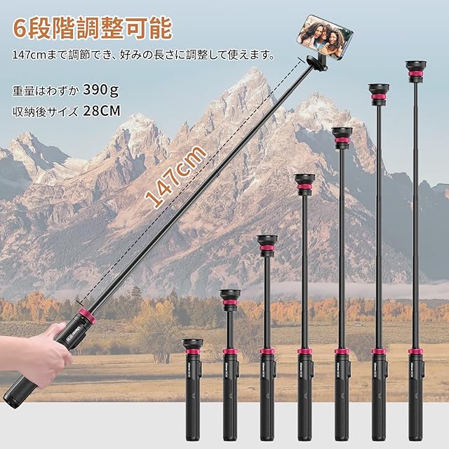 【6段階伸縮、角度調節可能】セルカ棒は航空グレードのアルミニウム合金を採用するため、軽く強度に優れています。6段階伸縮式で、高さ32.5cmから最長153cmまで(マホホルダー伸縮後)簡単に調節できます。また、Magasfeマホホルダーは水平360°回転でき、上下270°角度調節でき、全域の多角度調整確保します。お好みの角度に調節し、広い角度で写真やレンズを自由に撮影できます。自撮り、俯瞰撮影、旅行、パーティー、結婚式、アウトドア等最適!