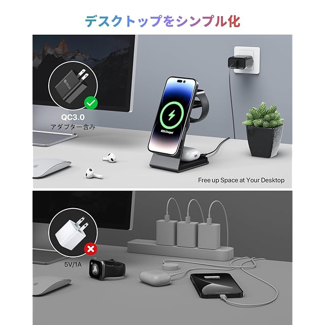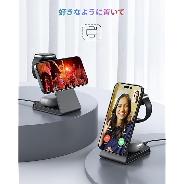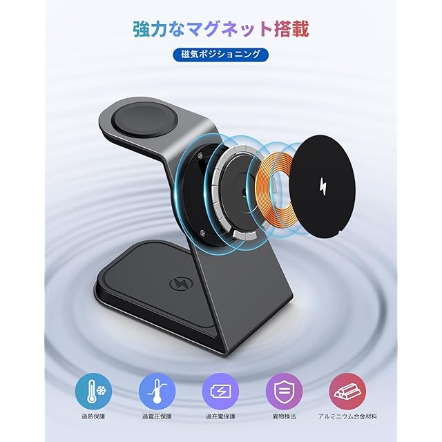 【2025年進級プロ3in1magsafe充電器】本体には塊ごとの強力なマグネットを内蔵し、塊ごと磁石はいくつかの小さな磁石に比べて磁力が40%増強されています。磁力の安定性を大きくに引き上げました。 iPhone を本体に近づけるだけで正しい位置に吸着します。同時にiPhone/Apple Watch/Airpodsに充電して、ケーブルから解放され、ひっかかることはありません。