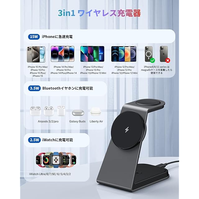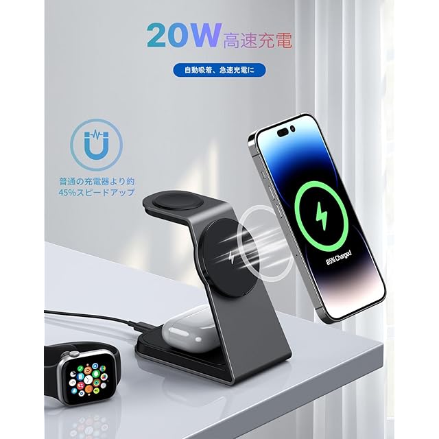 商品名:【2025年進級プロ版 Qi認証済み】TEPNICAL 3in1 ワイヤレス充電器 急速充電 Magsafe充電器 スタンド 20W出力 置くだけ マグネット式充電 iPhone 16/15/14/13/12 seris/Galaxy S20/S10/S10+/S9/Airpods 2/3/pro/Apple Watchに対応 日本語説明書付き 20WQC3.0アダプタ付属 ブラック