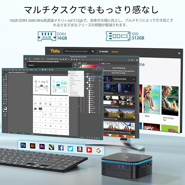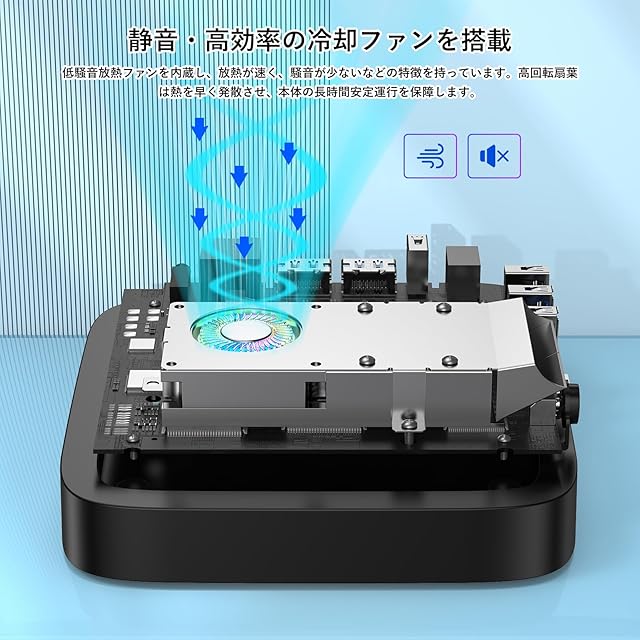 2.【大容量ワンステップで16GB,DDR4,512GBと+より効率的な熱放散のスマートファン搭載】mini pcは高速16GB ,DDR4,512GB(最大2TBまで換装可)M.2 2280 SSD.16を搭載しています。DDR4高週波メモリは、システム全体の応答性を高め、非常に速く、ラグやジャンプがありません。加えて2.5インチのM.2 SATA SSD/HDDを増設することも可能で、ビデオや画像、ファイルなを大量に保存できる。(換装用のメモリとSSD/HDDは含まれない)超高速PCIe SSDをサポートするから、SATA SSDより読み書きスピードが8倍ぐらいはやいです。●超静音冷却ファンを内蔵し、放熱が速く、騒音が少ないなどの特徴を持っています。高回転扇葉は熱を早く発散させ、本体の長時間安定運行を保障します。M.2 2280 SATA SSDになり高い持続書き込み速度、優れた耐衝撃性、より良い熱放散,省電力静音性、これまとは違う新しい世界が見えてるかもしれません。