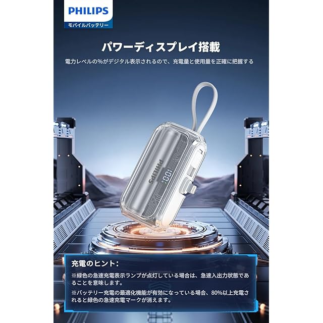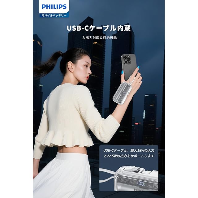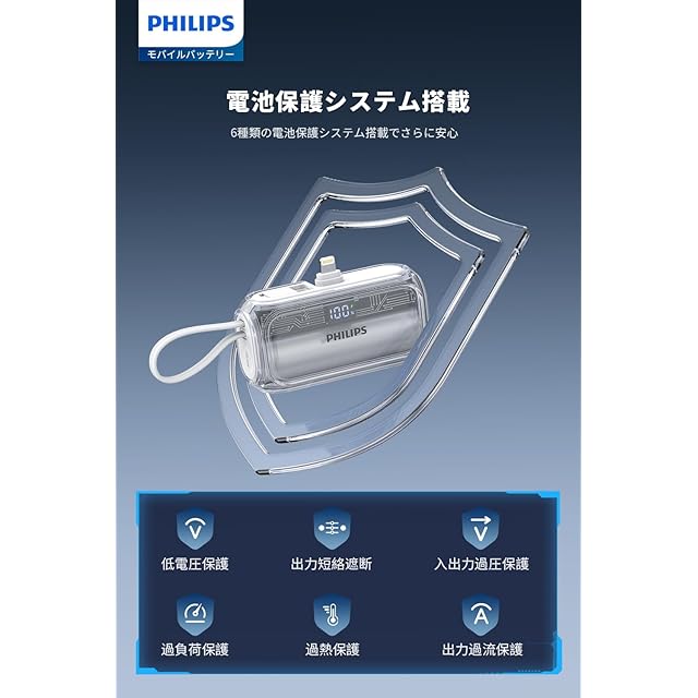 【パッケージ内容&品質】パッケージ内容:モバイルバッテリーx1、USB-Cケーブルx1、説明書x1。期は一年間になります。(ご注意:厚めのスマホケースを使用しているとコネクタ部分が奥まで刺さりきらないことがあるので、注意が必要です。)弊社が販売しているPhilips商品はすべて正規品です。何かご不明な点などございましたらお気軽にお問い合わせくださいませ。