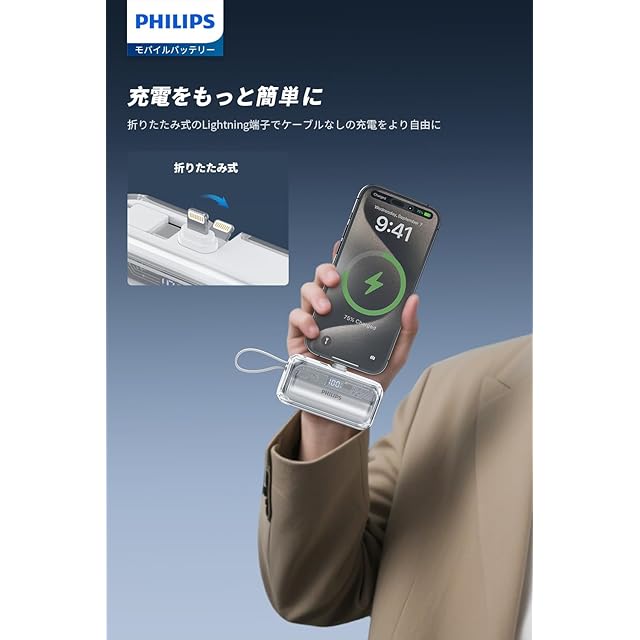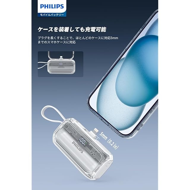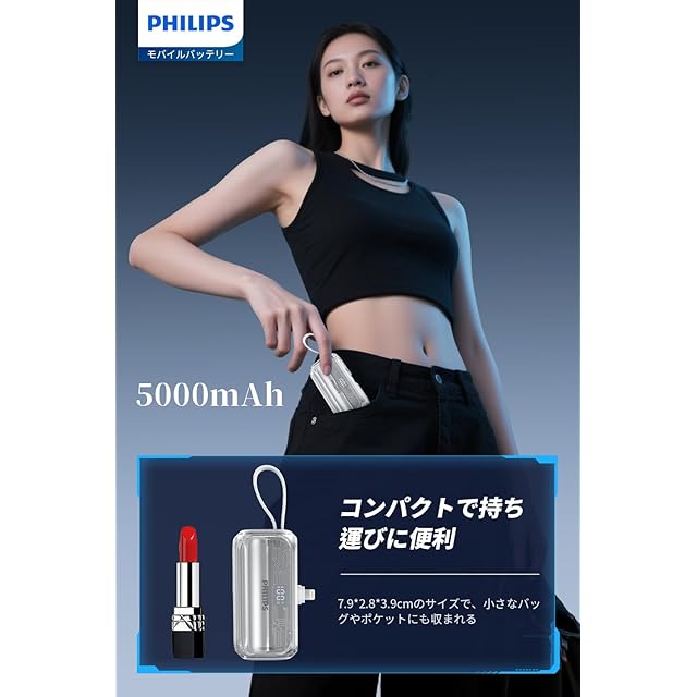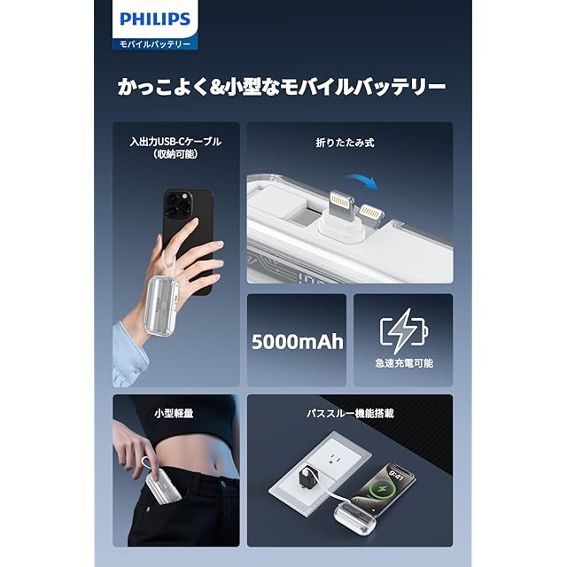 商品名:Philips (フィリップス) モバイルバッテリー 5000mAh 小型 Lightning コネクター USB-Cケーブル 内蔵 直差し コードレス 軽量 大容量 二台同時充電 モバイル充電器 パススルー機能 PSE認証済 タイプc &ライトニング デバイス対応 DLP2568VW