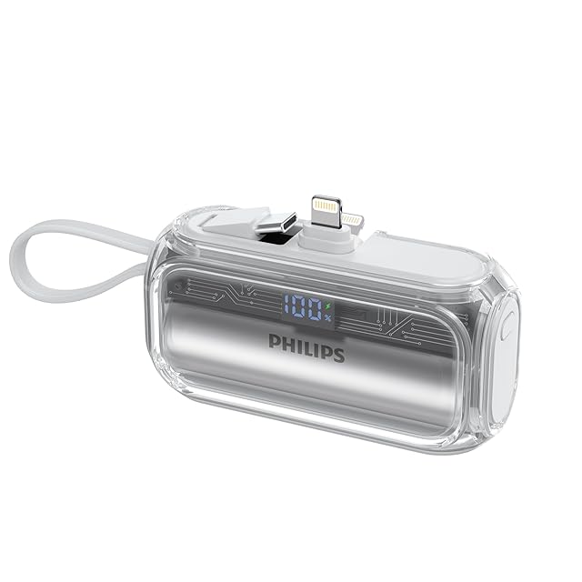 Philips (フィリップス) モバイルバッテリー 5000mAh 小型 Lightning コネクター USB-Cケーブル 内蔵 直差し コードレス 軽量 大容量 二台同時充電 モバイル充電器 パススルー機能 PSE認証済 タイプc &ライトニング デバイス対応 DLP2568VW
