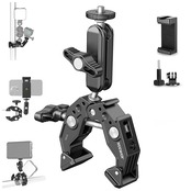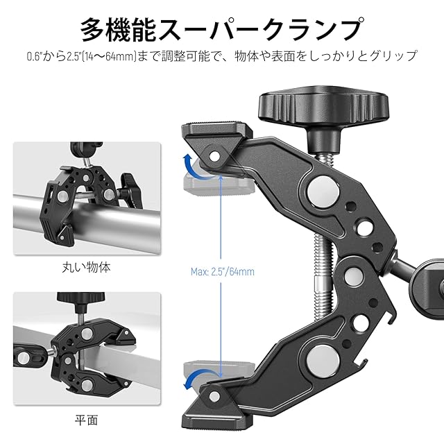 <br><br><b>商品説明</b> <br>0.6"-2.4" (14-60mm) のジョー開口部を備えたこのポールクランプチューブホルダーは、V字型の溝とピボットチップを備えており、デスクトップ、三脚、ショルダー リグ、自転車のハンドルバーなどの物体をつかむことができます。DJI Ronin-M Ronin MX & Freefly Movi 25mm および 30mm ロッドに対応します。 <br>1/4"スレッド、3/8"スレッド、およびARRI位置決めポイントにより、多数のアクセサリを接続できます。また、コールドシューブラケットを使用すると、LEDライトやマイクを固定できます。滑り止めのゴム製パッドは安定性を高め、デバイスを傷から守ります。 <br>2つの360°回転可能なボールヘッドにより、マジックアームはあらゆる角度から位置を変えることができ、あらゆる方向で撮影できます。ネジノブにより、ボールヘッドを数秒で固定できます。 <br>付属のスマホホルダーはスマートフォンをサポートし、アクションカメラアダプターはさまざまなアクションカメラを取り付けます。 <br>iPhone 15 Pro Max 14 13 12 11 Pro Max Plus Mini X Xs XR Samsung Galaxy S22 S23 Ultra Huawei P60 GoPro Hero 12 11 10 9 8 7 Black DJI Action 3などに対応します。また、1/4"ネジを使用してモニター、LED ライト、マイクなどを接続します。 <br><br><b>仕様</b> <br>モデル: ST83 <br>材質:アルミニウム合金、ステンレス鋼、ゴム <br>ジョー開口範囲: 0.6"-2.4"/14-60mm <br>最大耐荷重: 7.7lb/3.5kg <br>寸法: 6" x 3.4" x 1.6"/152 x 86 x 41mm <br>重量: 7.23oz/205g <br><br><b>パッケージ内容</b> <br>1×マジックアーム付きスーパークランプ <br>1×アクションカメラマウントアダプター <br>1×スマホホルダー <br>1×ユーザーマニュアル