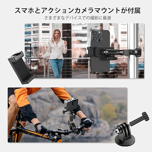 【カメラ&スマホ撮影】幅2.2"-3.3"/55-85 mmのスマホをしっかりと取り付けたり、付属のアダプターを使用してアクションカメラを取り付けたりできます。iPhone 14 13 12 11 Pro Max Plus Mini X Xs XR Samsung Galaxy S20+ S20 Huawei P40 Pro GoPro Hero 13 12 11 10 9 8 7 Black DJI Action 3などに対応します。また、1/4"ネジを使用してモニター、LED ライト、マイクなどを接続します。最大耐荷重は7.7lb (3.5kg)です。