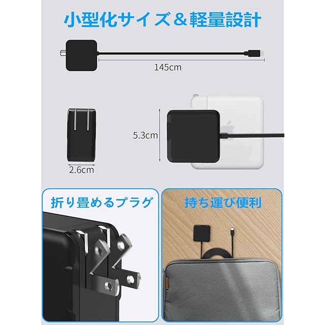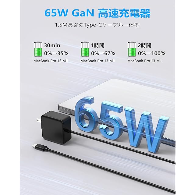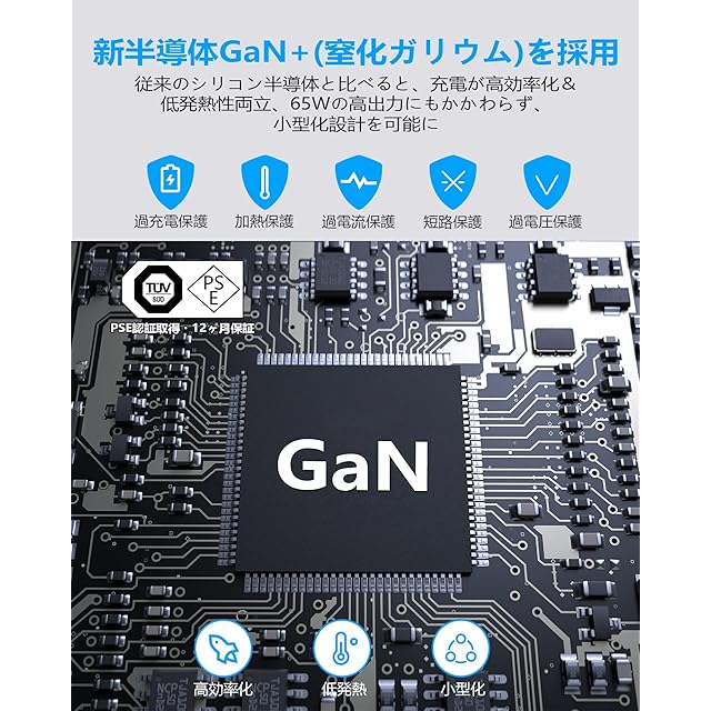 【新素材GaN+採用の65W USB-C 充電器】本製品は小型化、軽量化した持ち運び向けのタイプC 急速充電器です。この65W USB-C 充電器はGaN+窒化ガリウム素材を採用することによって、デカすぎるの純正ノートパソコン 充電器より余程軽量化且つ小型化を実現できましたの一方、充電も低発熱&高効率化していました。