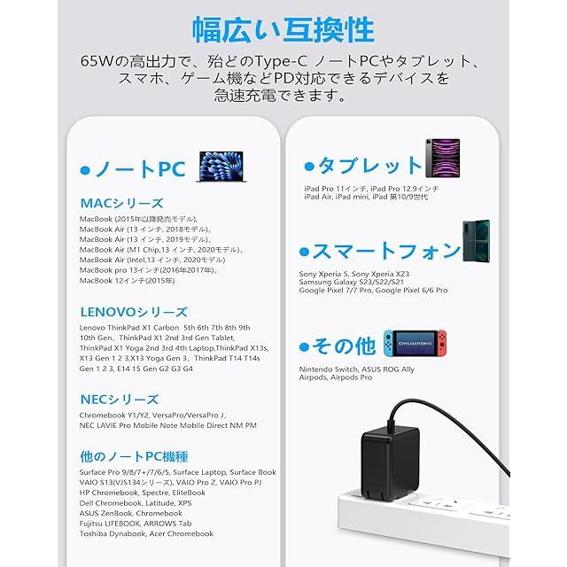 【幅広い互換性】本製品はType-C充電インターフェースのノートパソコンやラップトップ及びタブレット、スマートフォン、ゲーム機などに対応できる65W USB-C 充電器です。主な対応機種:MacBook pro, MacBook Air, Lenovo ThinkPad, Lenovo Yoga, VAIO Pro, NEC LAVIE, NEC Chromebook, HP Spectre, ASUS ZenBook, ASUS Chromebook Flip, Acer Spin, Acer SWift, Dell Latitude, Dell XPS, Xiaomi Air, Huawei Matebook, Fujitsu LIFEBOOK, Toshiba Dynabookなど殆どのType-CノートPCに急速充電ができます。※Type-C 65W及びその以下の製品に適用。