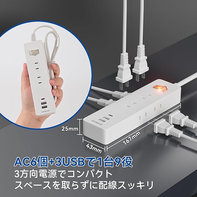 商品名:SAYBOUR 電源タップ USB 延長コード 5m コンセント 6個 Type-C USB-A 雷ガード スイッチ 白 AJ-6100