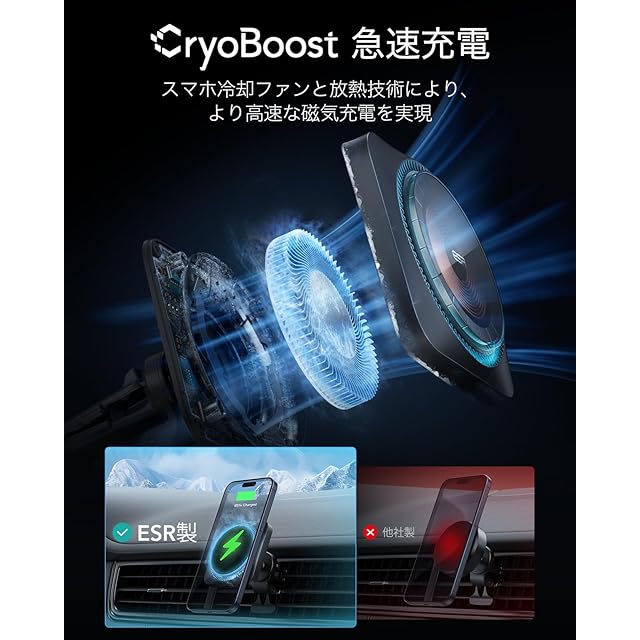 商品名:ESR 【冷却ファン付き】スマホホルダー 車 ワイヤレス充電 magsafe 車載ホルダー スマホ冷却 マグセーフ充電器 エアコンルーバー/ダッシュボード式車載ホルダー CryoBoost 高速充電 スマホスタンド iPhone16/15/14/13/12シリーズ&SamSung S25対応 ブラック
