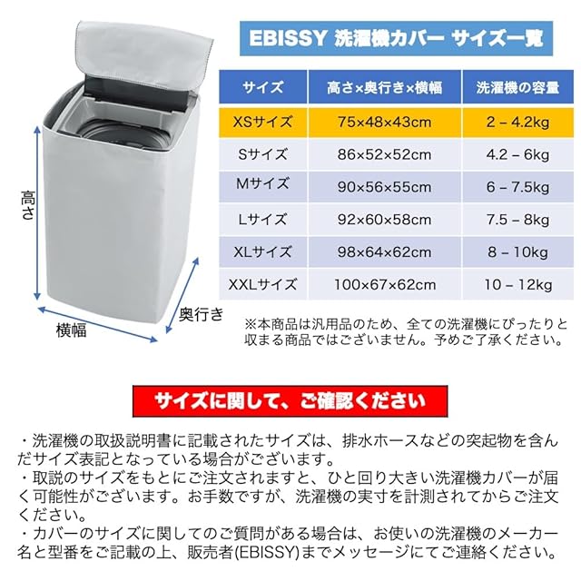 仕様 : ファスナー(ジッパー)開閉式 4面すっぽり囲い / XSサイズ : (約) 高さ75cm×奥行き48cm×横幅43cm / 洗濯機の容量 : 2-4.2kg