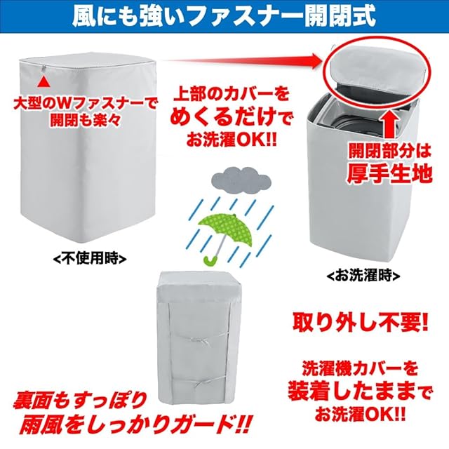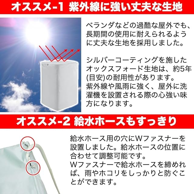 全自動洗濯機を紫外線や雨、雪、ホコリなどからしっかり守る防水加工済(生活防水)の4面すっぽり仕様の洗濯機カバーです。表面にシルバーコーティングを施しておりますので、紫外線に強い商品となっております。 洗濯機カバー上部の開閉部分は、厚手生地(表面:シルバーコーティング/裏面:PVCコーティング)を採用し、より丈夫な洗濯機カバーに仕上げました。 給水ホースを脱着し、カバーを洗濯機の上から被せて、本体背面のひもを結ぶだけで簡単に装着できます。
