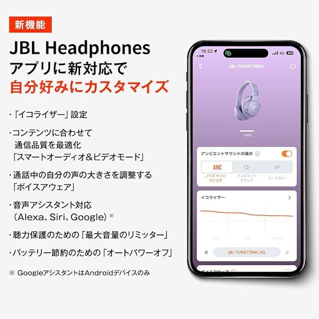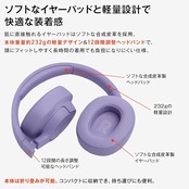 JBL TUNE770NC 騒音集音用マイクをハウジング本体外側に配置するフィードフォワード方式と鼓膜に近いドライバーユニット側に配置するフィードバック方式の両方式を採用したハイブリッド式ノイズキャンセリング機能を採用。前モデルよりも高性能な消音パフォーマンスを実現。外音取り込み機能で、ショッピングの会計時などもスムーズに対応できます。最大約70時間のバッテリーライフにより、長時間JBL Pure Bass Soundを楽しむことができます。5分で3時間再生できる急速充電にも対応。軽量(約232g)折りたたみ設計で長時間の使用も快適、持ち運びに便利です。マルチポイント機能によりスマホやタブレットなど2台のBluetoothデバイスと同時接続が可能。アプリに新対応し、自分だけのイコライザを作成することができます。本体のカラーにあわせた3.5mmオーディオケーブル付属で、バッテリーが切れた時や、安定した音声再生や通話品質が必要な際に安心です。Bluetoothバージョン5.3 LE Audioに対応予定です。