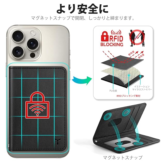 [TUCCH] スマホカードケース 磁気吸着 6枚カード収納 [RFIDブロッキング] PU合皮 磁気ウォレットケース iPhone 16/16Plus/16Pro/16Pro Max/15/14/13/12シリーズ対応 ブラック