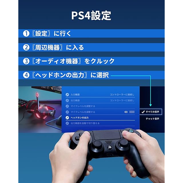 人間工学&快適:付け心地のいいゲーム用ps4 ヘッドセット:肌に優しい革素材を採用されるイヤーマフ、優しく耳を包みこむことで、長時間使用しても耳が痛くない。頭頂部も柔らかいイヤークッションを装着し、弾力性強くて、頭のサイズを問わず、誰でも気軽く使えます。印象的なLEDデザイン、様々なゲームの雰囲気を盛り上げます。