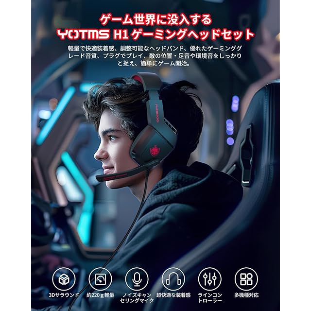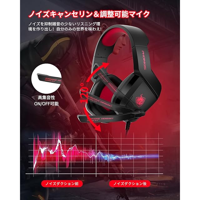 <br>モデルであるゲーミングヘッドセットをからお届けいたします。<br><br>蛋白質の革製の密閉型イヤパッドを採用し、外部の雑音をシャットアウトするだけでなく、イヤパッドから漏れた音をマイクで拾ってしまうといったループ現象を防ぎます。<br>高中低音域から重低音までをクリアに再生する大型50mmマグネットドライバを使用しており、幅広い音楽・ゲームに対応できるヘッドフォンです。<br>ノイズキャンセリング機能・LEDライトを搭載しており、ヘッドアームの調整も可能です。<br><br>軽量設計:ヘッドセット全体が軽量で、柔らかいイヤークッションを装着した人間工学に基づいたソフト<br>蛋白質レザーイヤーパッドを採用しており、優しく耳を包みこむことで、長時間の使用でも快適にできるような作りとなります。<br>保温性と通気性があり、冬には保温効果を高めて夏には熱や湿気が減らせます。<br><br>ハイクオリティ音質:クリアな高中音域から強力な重低音までを再生する大型50mm強磁力<br>ネオジウムマグネットドライバを装備し、臨場感あふれるサウンド音質最高の密閉型イヤホンで様々なゲーム(例えばPS4、任天堂機種、FPS、COD、MMOなど)を楽しめます。<br><br>立体的で臨場感に満ちた音場を忠実に再現し、正確に敵の足音を聞き取り位置や動きを察知することができます。