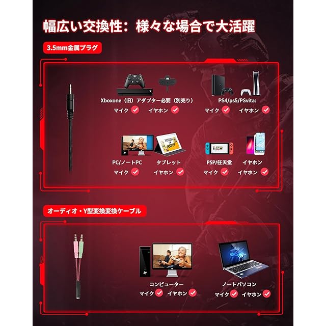 商品名:YOTMS ゲーミングヘッドセット 有線 ヘッドホン マイク付き ps4 ヘッドセット ps5ヘッドセット switch ヘッドホンノイズキャンセリング ヘッドホン ゲーム スイッチ対応 Xbox One PC用 軽量 快適 密閉型 重低音 伸縮可能 子供 男女兼用 赤