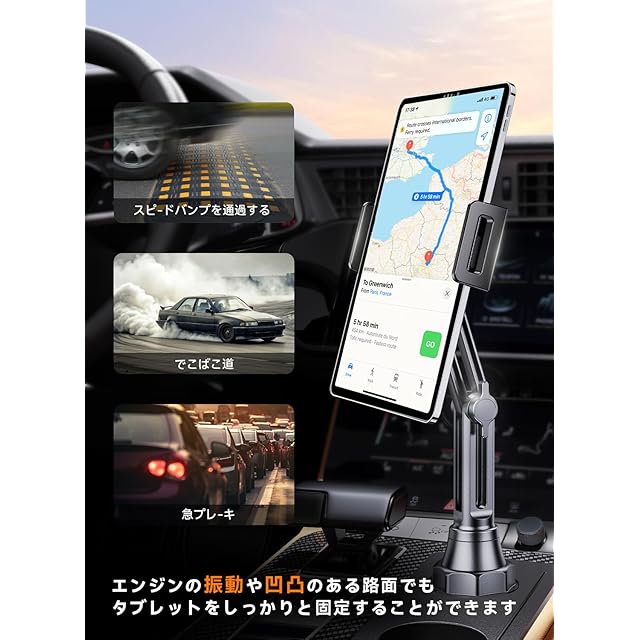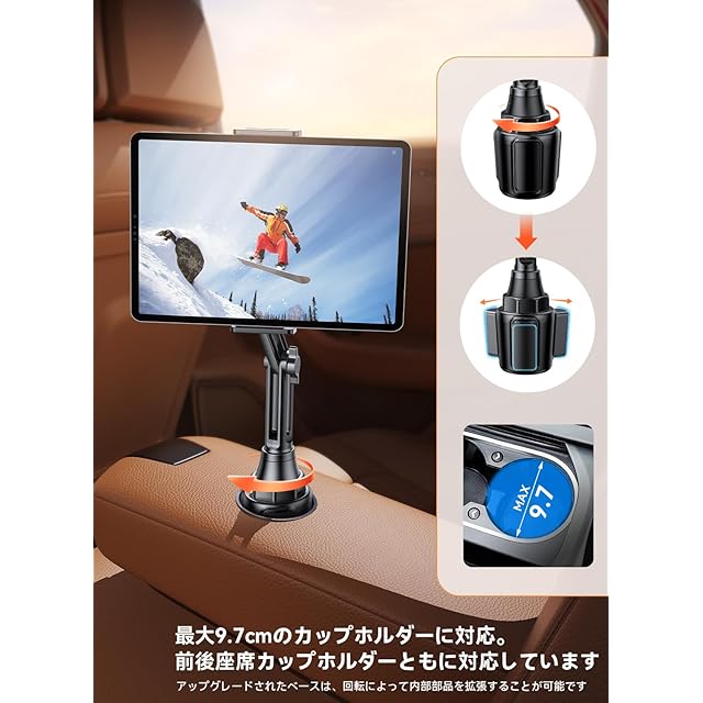 【アップグレードされたベース】:自動車のカップホルダーに取り付ける用のタブレットホルダー ダーで、自動車の前後座席に対応しています。1.車載タブレットホルダーベースの拡張子直径を増やし、最大9.7CMまで拡張することができます。2.最新のABSプラスチック素材を採用することで、このタブレットホルダー ダーは各状況により柔軟に対応することができます。凸凹の道路でも、走行中にiPadをしっかりと固定することができます。
