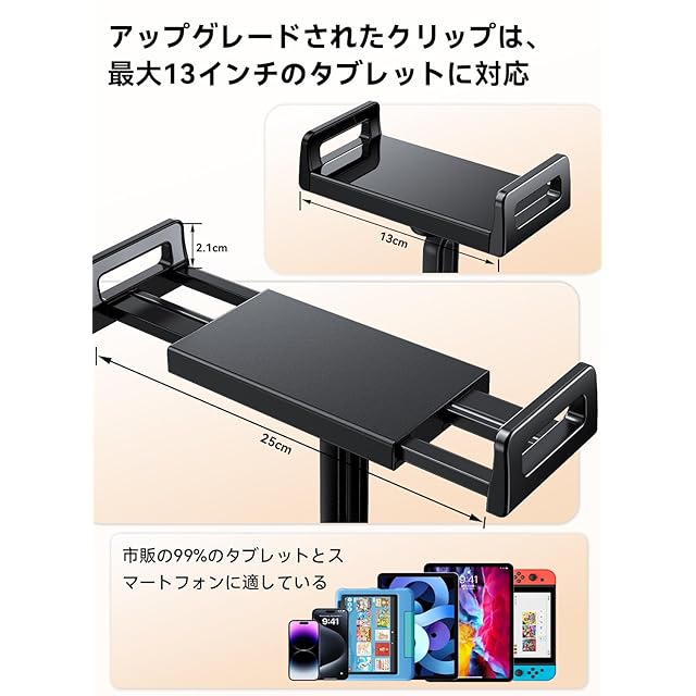 【アップグレードされたクリップ】:アップグレードされたクリップの最大深さは2.1CMで、最大24CMまで拡張することができますので、重厚なケースを装着したタブレットにも対応可能です。クリップの両側に柔らかいシリコン滑り止めマットが設けられており、走行中にタブレットが落ちるリスクを防ぐことができます。