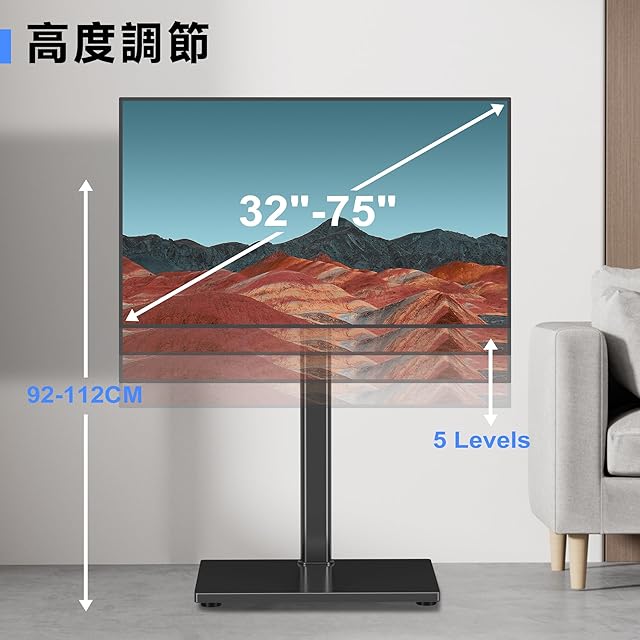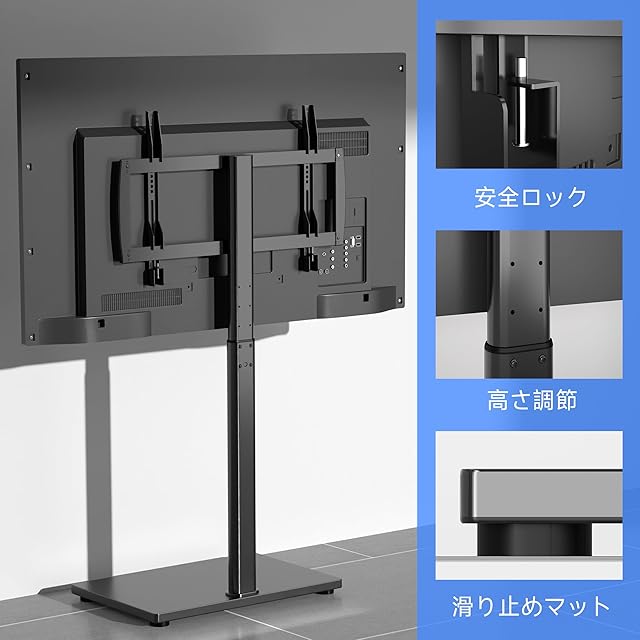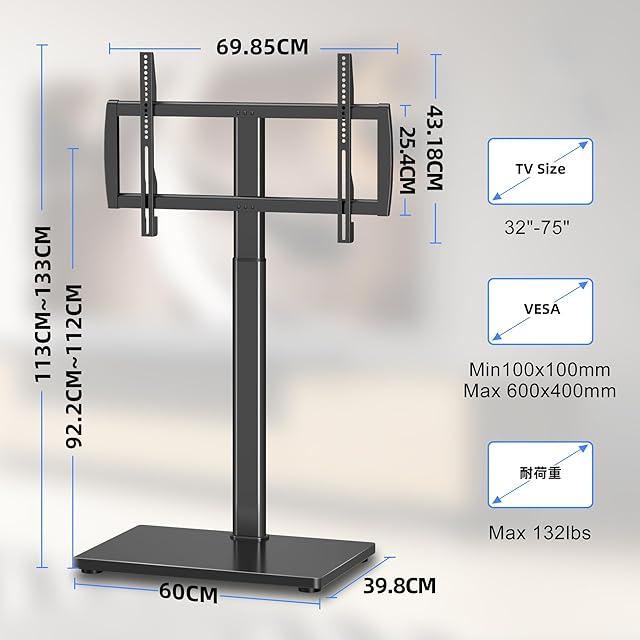 【取り付け可能なテレビ】対応インチ:32~75インチ以内。対応重量:40kg以内。対応VESA(テレビ背面のネジ穴間の距離):100MMx100MMから400MMx600MMまで。※ご注意:ご購入前、テレビの重量、サイズ及びVESA規格をご確認ください。