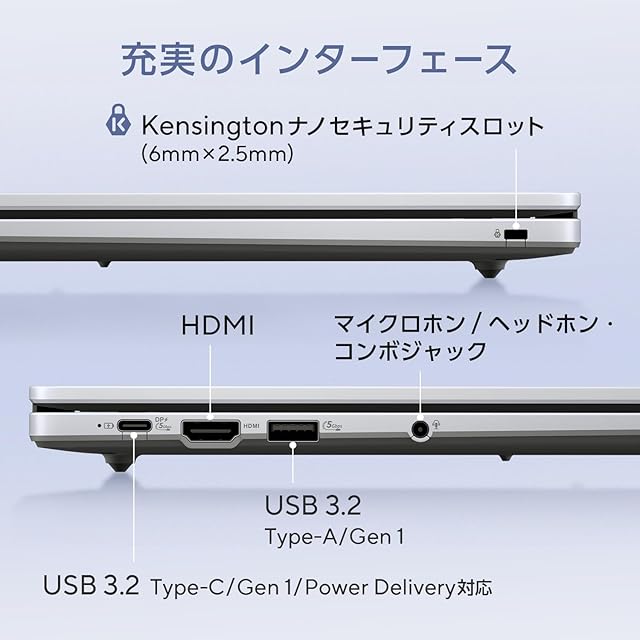 【USBポート】USB3.2 (Type-C/Gen1/Power Delivery対応)×1 ※データ転送と映像出力、本機への給電をサポート、USB3.2 (Type-A/Gen1) ×1【ディスプレイ出力】HDMI×1、Type-C×1【オーディオ】ステレオスピーカー内蔵 (2W×2)、アレイマイク内蔵、マイクロホン/ヘッドホン・コンボジャック×1【通信機能】無線:IEEE802.11a/b/g/n/ac/ax (Wi-Fi 6), Bluetooth 5.3