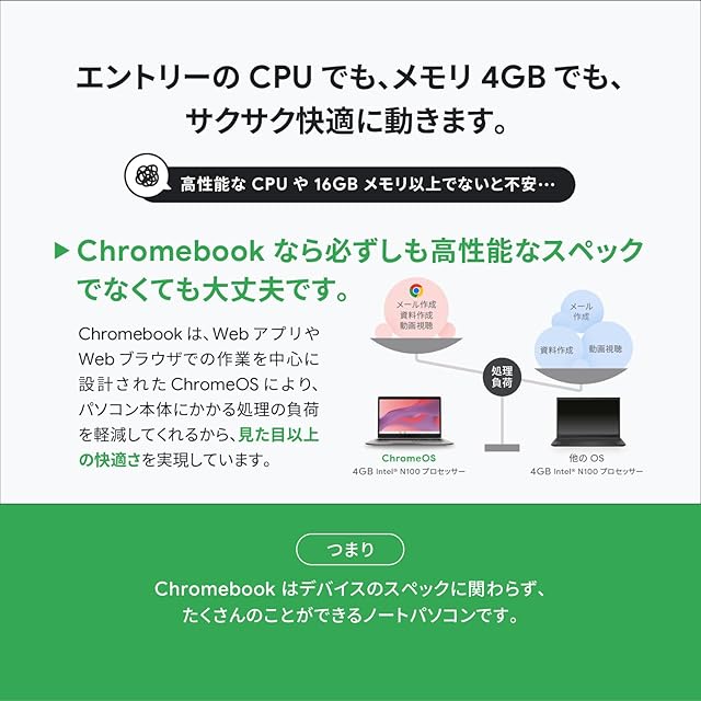 【CPU】インテル Celeron N4500 プロセッサー【メモリ】8GB LPDDR4X-2933【スロット】オンボードメモリのみ【ストレージ】64GB eMMC【ゼロタッチ登録】対応【バッテリー駆動】約13.8時間【消費電力】最大約45W