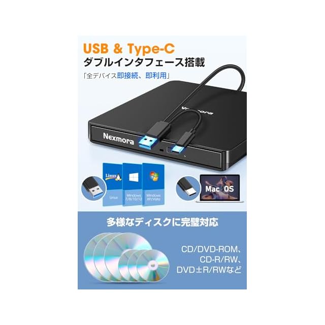 商品名:【2024革新型・高速USB3.0対応】 CD DVDドライブ 外付け 静音 DVDプレーヤー 外付けDVDドライブ USB3.0&Type-C両接続 読取/書込可 CDプレーヤー バスパワー駆動 外付けCDドライブ 軽量 薄型 光学ドライブ 外付け CDドライブ Mac PC パソコン Windows11対応 Windows10/8/7XP 外付け CD DVD ドライブ (黒)