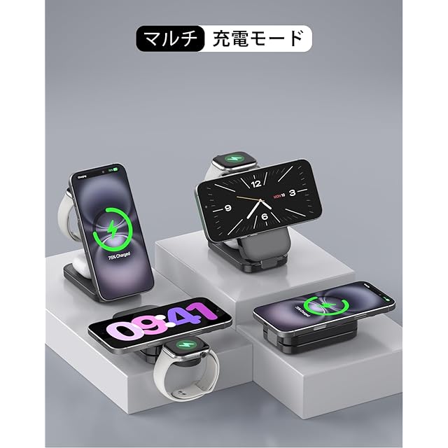【幅広い互換性&パッケージ内容】iPhone16/15/14/13/12/シリーズ(magsafeケースを使用してください)。【ご注意】:airpodsの場合、magsafe充電ケースが対応するが、Lightning充電ケースが対応しない。※ スマートウォッチはiWatchのみ対応。パッケージ内:ワイヤレス充電器本体×1、20W PD3.0アダプター×1、USBC-Cケーブル×1、日本語取扱説明書×1。