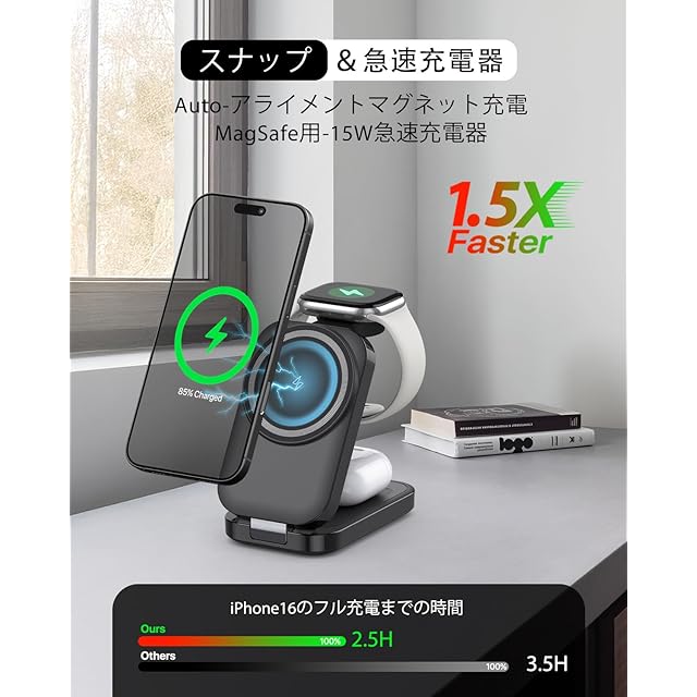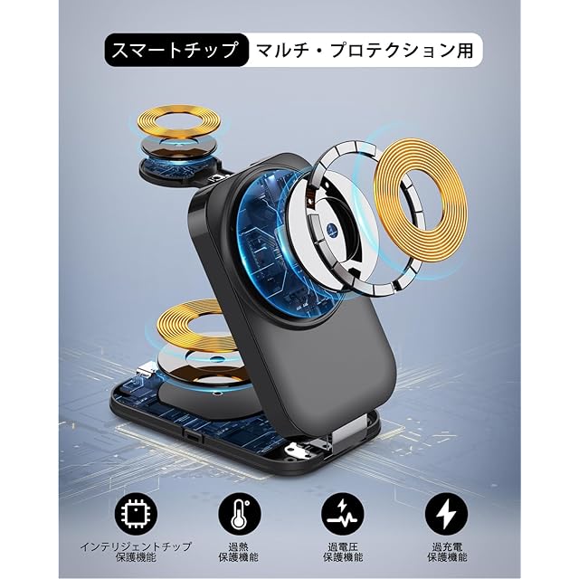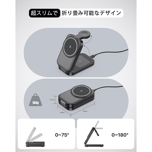 【3in1&折り畳み式】このmagsafe充電器はiPhone、Apple Watch、AirPodsを同時に充電可能!外出先でも充電器1つあればOK、コードの煩わしさから解放されます。複数の充電ケーブルを持ち運ぶ手間が省け、よりすっきり便利です。超軽量・コンパクトmagsafe充電器、折り畳みサイズ約60*23*95mm、重さ:約184g。折りたたむと携帯電話の半分の大きさになります。 旅行、出張に最適。スリムな折りたたみデザインでバッグやポケットに収納可能。開閉部は5,000回の耐久テストをクリアした頑丈なヒンジ採用で、長期間安心してご利用いただけます。