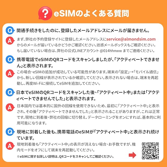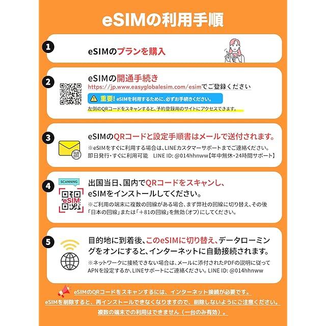 【eSIM取得方法】ご購入後、https://jp.www.easyglobalesim.com/esim にアクセスし、必要事項を入力してください ➡ メールアドレスに説明書とeSIMのQRコードが届きます。⭐QRコードをスキャンして簡単に接続!(インターネット環境が必要です)