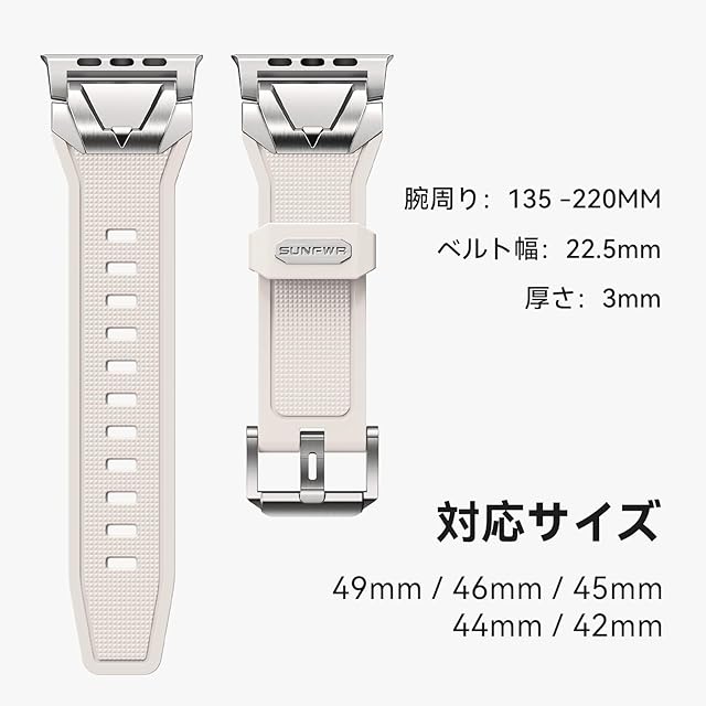 SUNFWR アップルウォッチ バンドは、コンパチブルApple Watch Ultra 2/1・Series 10~1・SE2/SE、手首135~220mmに柔軟フィット。TPUを超える肌馴染みを実現した高純度液体シリコンを採用し、低刺激設計で敏感肌でも安心。耐汗・耐摩擦性に優れ変色・硬化ゼロの耐久性に加え、環境配慮型素材で環境ホルモン不含。スポーティで洗練されたデザインはステンレスアダプターの確固たる固定性と通気孔構造を融合、ビジネスからアウトドアまで24時間快適に装着可能。工具不要3秒着脱&軽量柔軟性で日常から激しい運動シーンまで対応。12ヶ月+24時間サポート付きで、機能性とスタイルを兼ね備えた次世代バンドです。