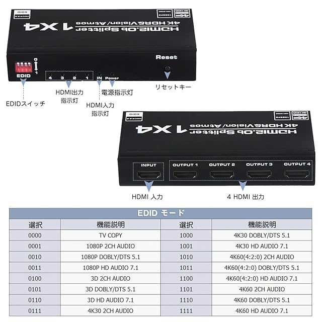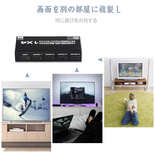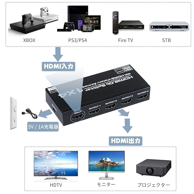 商品名:HDMIスプリッター1x4 HDMI 分配器 1入力4出力 4K 60Hz オーディオビデオ スプリッター HDMI2.0b HDCP 2.2 フルウルトラHD 3D HDRをサポート HDTV、Blu-Ray、DVD、PS4、Xboxなどに対応