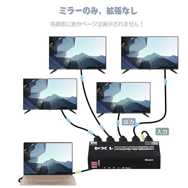 HDMIスプリッター1 入力 4 出力は、1つのHDMI入力信号を4つの同一のHDMI出力信号に複製します。すべてのディスプレイは、信号を劣化させることなく、同じビデオとオーディオを同時に表示します。<br><br> <b>パッケージ内容:</b><br> 1 x Hdmiスプリッター1入力4出力<br> 1 x 5V/DC電源ケーブル<br> 1 x 取扱説明書<br><br> <b>特徴:</b><br> ★HDMI2.0bバージョンをサポート<br> ★HDCP 1.1 / 1.2 / 1.4 /2.2をサポート<br> ★3Dビデオフォーマットをサポート<br> ★最大3840 x 2160 / 60Hzの高解像度をサポート<br> ★18.2Gbpsの最高レートをサポートし、TMDSクロックは最大600MHzまで可能<br> ★電源の形式:<br> ★入力:AC(50HZ、60HZ)100V-240V<br> ★出力:DC5V / 1A<br><br> <b>AWG26 HDMI 標準ケーブルをサポート:</b><br> 入力最大15m、出力最大25m<br> (解像度が4Kの場合、入力最大8mで、出力最大15m)<br><br> <b>HDCP2.2、HDMI 2.0、RGB(4:4:4)、HDRをサポート:</b><br> HDMIスプリッター1 入力 4 出力は、HDCP 2.2、HDMI2.0b、RGB(4:4:4)、4K@60HZをサポート<br><br> <b>HDRを体験する:</b><br> ハイダイナミックレンジ(HDR)は、ゲームビデオの明るさを向上させ、豊かで活気に満ちた自然でリアルな色を表示します。<br><br> <b>4K Ultra HDおよび3Dをサポート:</b><br> HDMI解像度:3D、フルHD、4kx2k、最大3840X2160 / 60Hz、RGB 4:4:4<br> オーディオ形式をサポート:DTS-HD /Dolby-True HD / DTS /Dolby-AC3 / DSD<br><br> <b>▲注意事項:</b><br> 1. 4つの出力は独立しており、1つのディスプレイだけが機能している場合でも機能します 2. この1x4HDMI分配器は画面をミラーリングするだけで、拡張はサポートされていません。各画面に異なるページは表示されません。<br> (▲hdmiスイッチ4入力1出力ではありません)<br> 3. HD HDMIスプリッターは、最低解像度の標準に従って画像を配信します。<br><br> <b>EDID機能:</b><br> 柔軟なEDIDスイッチングは、さまざまな解像度のニーズに対応できる16つのスイッチモードを提供します。<br><br> <b>色々な用途:</b><br> 超市、トレーニング、テレビ店、会議室、ホームシアター、学校、マルチメディア教育、データ管理センター、モールテレビ、活動会場などに適しています。