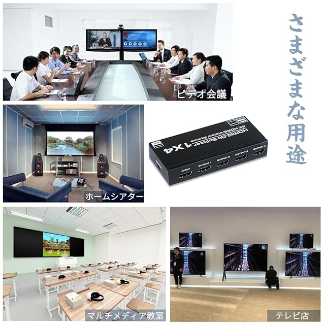【HDMI分配器1x4】HDMI分配器1x4は、入力HDMI信号を4つの同一のHDMI出力に同時に分配します。 長いHDMIケーブルの端に配置して、HDM1信号を再生成することもできます。