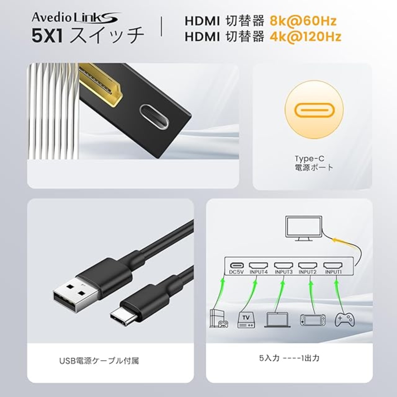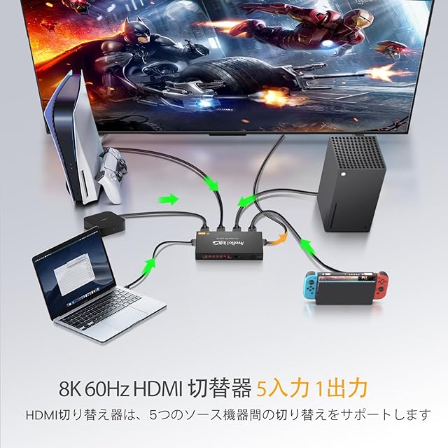商品名:avedio links HDMI 切替器 8K@60Hz HDMI切り替え器 5入力1出力 4K@120Hz HDMI 2.1 セレクター 自動/手動切替機能 UHD、3D、HDR 10、HDCP2.3、48Gbps HDMI HDMI ハブ 拡張 リモート付き