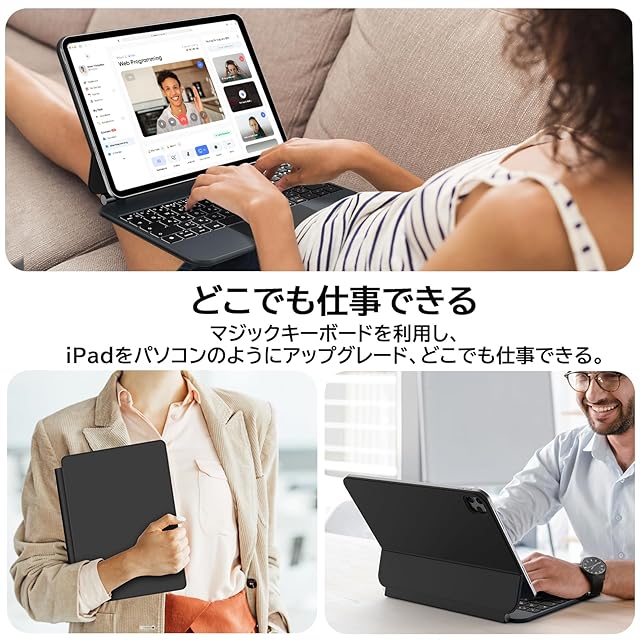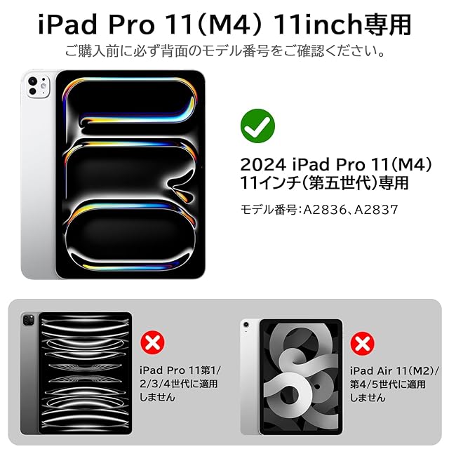 【購入前のご注意】本マジックキーボードは2024 iPad Pro 11inch(M4)第五世代に専用して設計された。適用モデル番号はA2837、A2836です。ご購入前に必ずご確認ください。iPadと接続して給電するため、お使いのiPadモデルが互換性があることを確認してください。そうでない場合は使用できません。