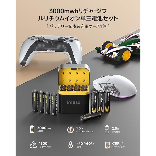 商品名:imuto 充電電池 単三 1.5V 充電式単三リチウム電池 16本入りセット 3000mWh大容量充電池 自己放電抑制 1600回循環使用可能 超長持続時間 充電器組み合わせ 収納バッグ 1~8本同時充電可能 2.5h急速充電 充電ケーブル付属 日本語取扱説明書付き PSE認証
