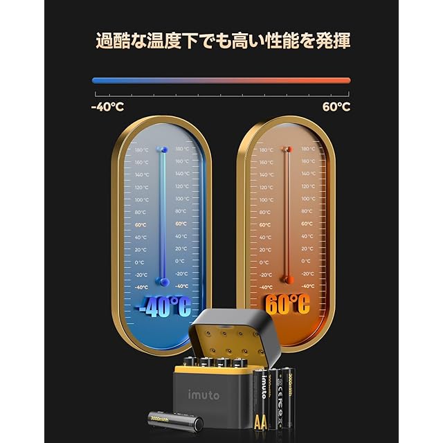 「1.5V充電池&2.5H急速充電」imuto 1.5V高電圧出力の充電式単3リチウム電池は、放電サイクルを通じて、1.5Vの電圧出力を提供ます。1.2Vニッケル水素電池よりも強力で、複数のデバイスに対応することができます。imutoバッテリー充電ケースは急速充電でき、わずか2.5Hで8本のバッテリーを満たすことができます。安全保護を搭載され、充電中の安全性について心配する必要はありません。